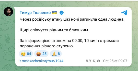 "Из-за российской атаки этой ночью погиб один человек. Искренние соболезнования родным и близким. По информации по состоянию на 09:00, 10 киевлян получили ранения различной степени", - говорится в сообщении.