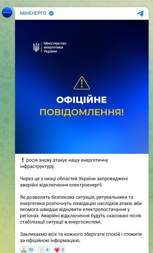 В Минэнерго заявили, что Россия снова атакует нашу энергетическую инфраструктуру в Харьковской, Черниговской, Днепропетровской, Львовской, Ивано-Франковской, Черкасской и Донецкой областях.