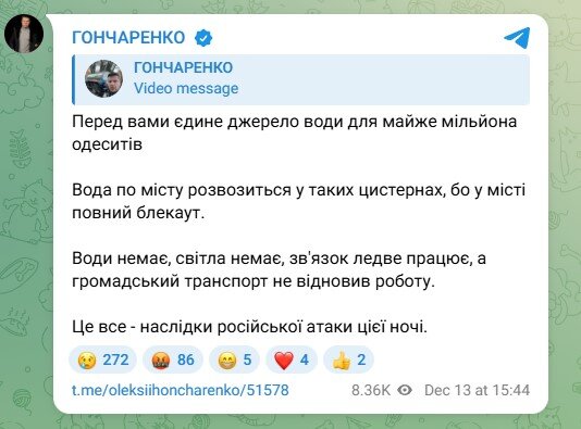 Народный депутат Алексей Гончаренко показал в своем Телеграм-канале масштабы последствий ночной атаки. По его словам, вода для почти миллиона одесситов развозится по городу в специальных цистернах из-за полного блэкаута.
